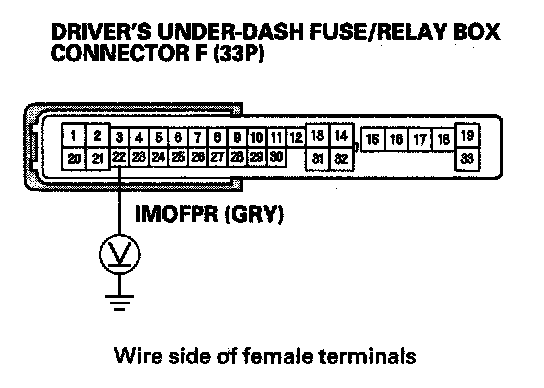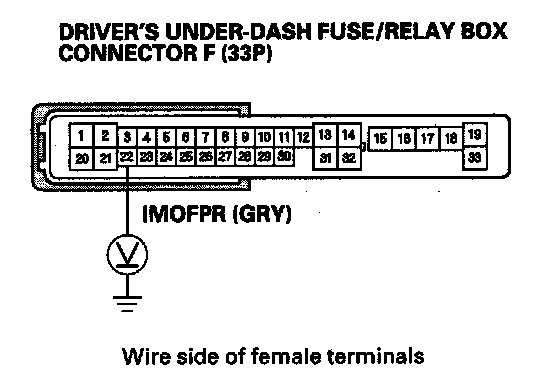 26. Turn the ignition switch to ON (II), and measure voltage between driver's under-dash fuse/relay box connector F (33P) terminal No. 22 and body ground after 2 seconds.