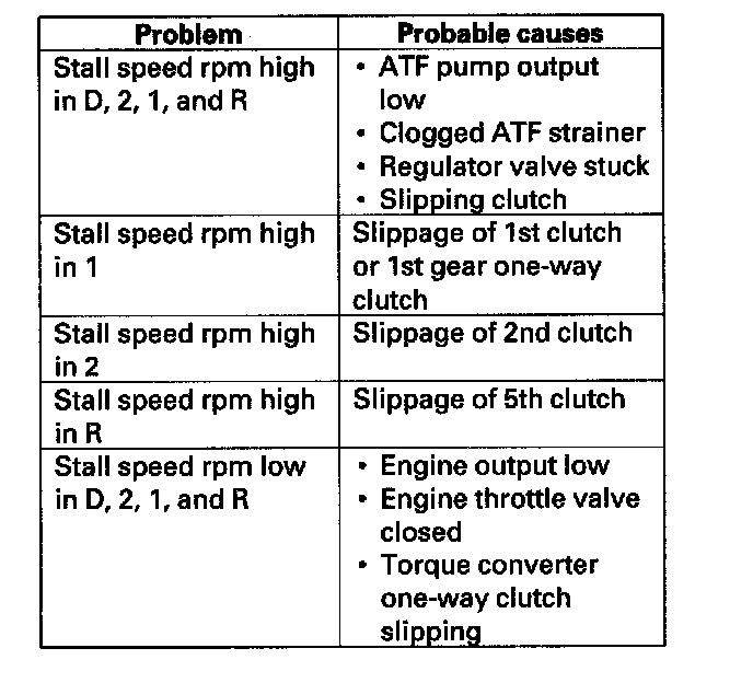 8. If any of the stall speeds are out of the service limit, refer to the problems and probable causes listed in the table.