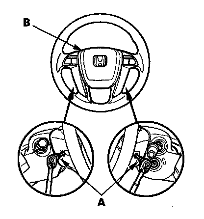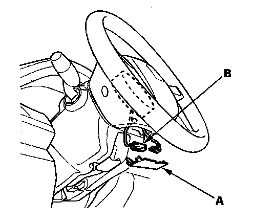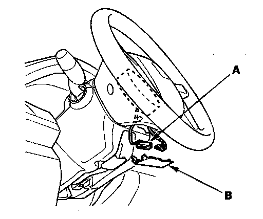 2. Remove the access panel (A) from the steering wheel, then disconnect the driver's airbag 4P connector (B) from the cable reel.