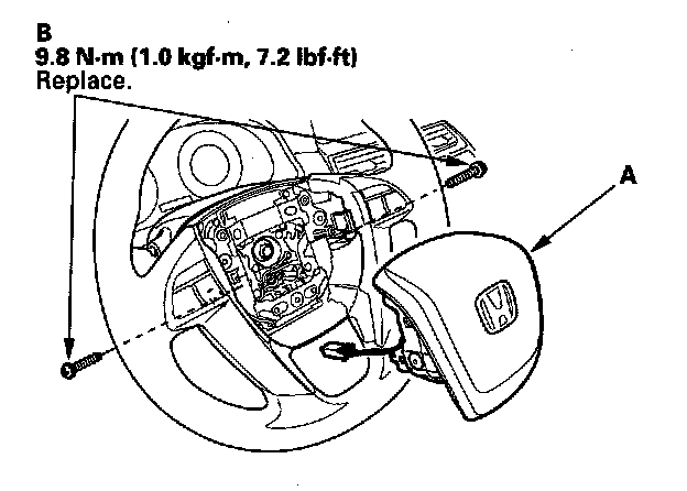 1. Place the driver's airbag (A) in the steering wheel, and secure it with new TORX bolts (B).