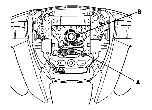 4. Disconnect the connector (A) from the cable reel, then remove the steering wheel bolt (B).