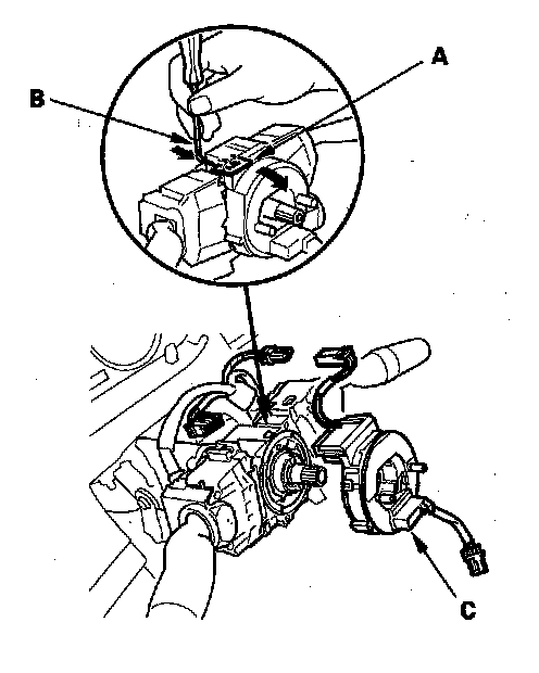 8. Release the lock tab (A) under the cable reel connector with a 90 ° hook shaped tool (B). Slide the tool below the cable reel connector just above the lock tab. Release the lower lock tab (C), and slide the cable reel off the column.