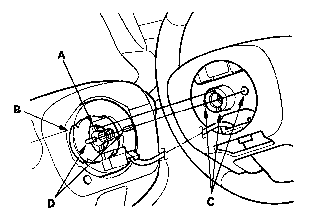 7. Position the two tabs (A) of the turn signal canceling sleeve (B) as shown, and install the steering wheel on to the steering column shaft, making sure the steering wheel hub (C) engages the pins (D) of the cable reel and tabs of the turn signal canceling sleeve: Do not tap on the steering wheel or steering column shaft when installing the steering wheel.
