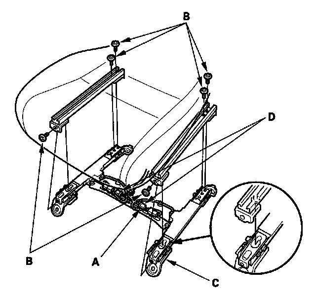 - Make sure both of the hooks (A) on the seat track are properly secured to the front bracket (B). If the hooks are not properly secured, the seat weight sensors will not perform properly.