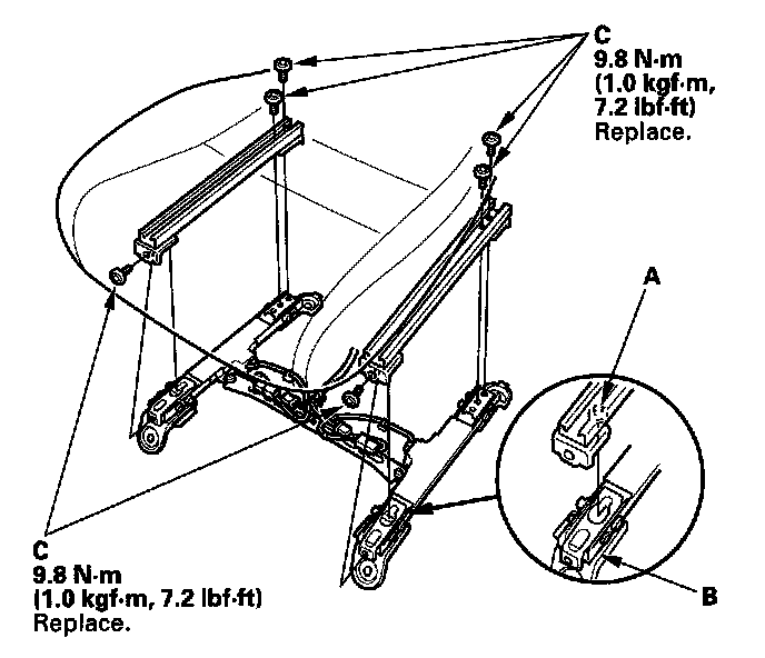 1. Install and torque the new front passenger's weight sensors with new mounting bolts (C) under the seat cushion.