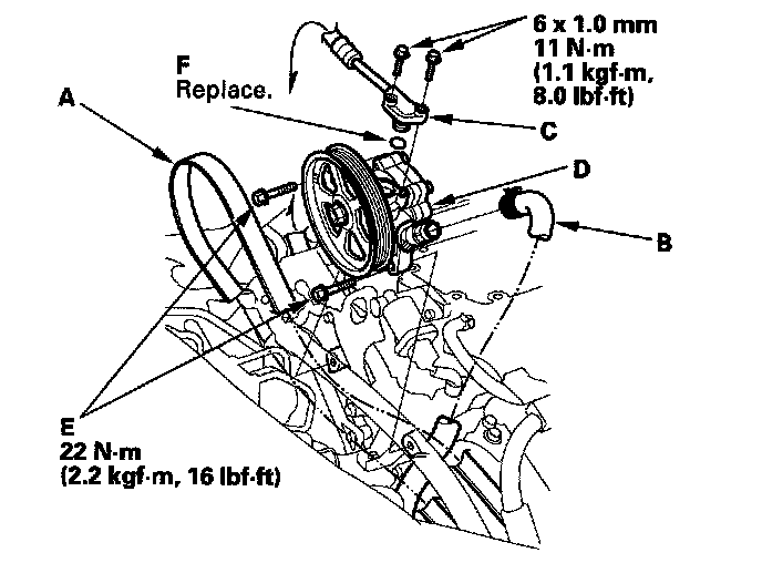 6. Remove the pump mounting bolts (E).