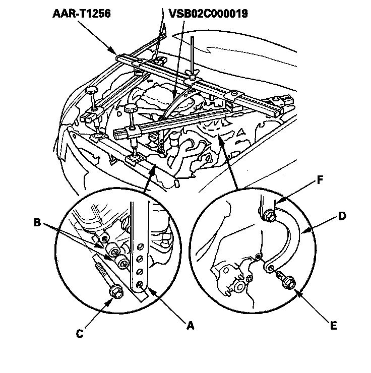 13. Lift and support the engine with engine support hanger (AAR-T1256) and engine hanger balance bar (VSB02C000019). Attach the front arm (A) to the front cylinder head with several spacers (B) and the bolt (10 x 1.25 mm) (C). Attach the 2008 V6 attachment arm (SIL02C000033) (D) to the rear cylinder head and the bolt (8 x 1.25 mm) (E), then attach the rear arm (F) to the 2008 V6 attachment arm.