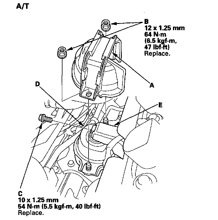 15. Remove the engine mount bolt (C) from the rear engine mount (D) and the rear engine mount bracket (E).