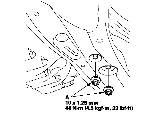 35. Torque the subframe mounting bolts to the specified torque values starting with the right-rear bolt. Use the frame positioning guide pin when tightening the rear side bolts (A).