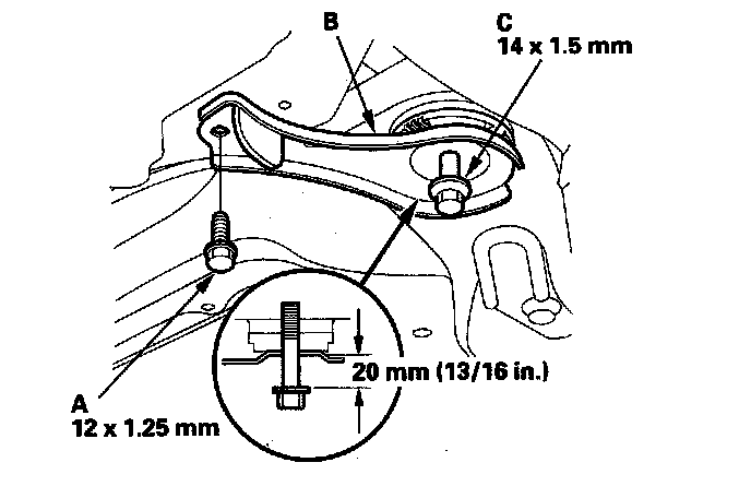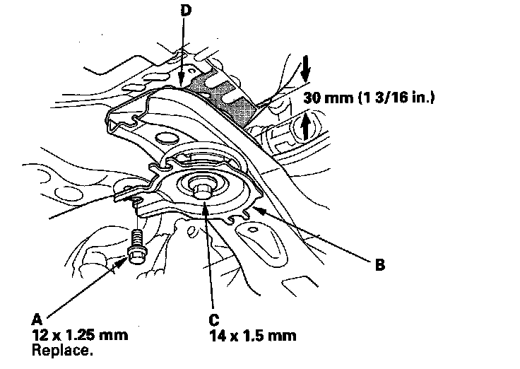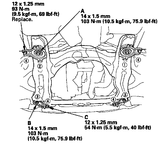 ^ Before tightening the front side subframe mounting bolts (B), raise the jack and loosely install the 12 mm flange bolts (C) to align the subframe front bracket.
