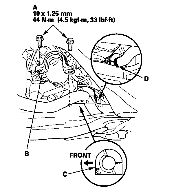 NOTE: During installation, align the paint marks (D) on the stabilizer bar with the side of the bushings.