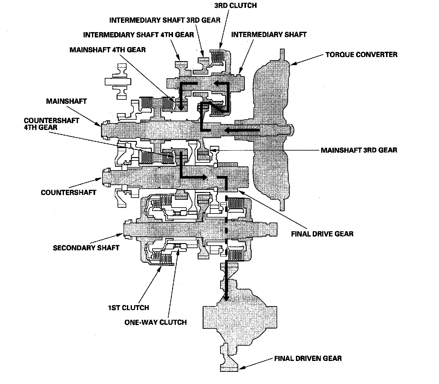 ^ Hydraulic pressure is applied to the 3rd clutch, then the 3rd clutch engages the intermediary shaft 3rd gear with the intermediary shaft.