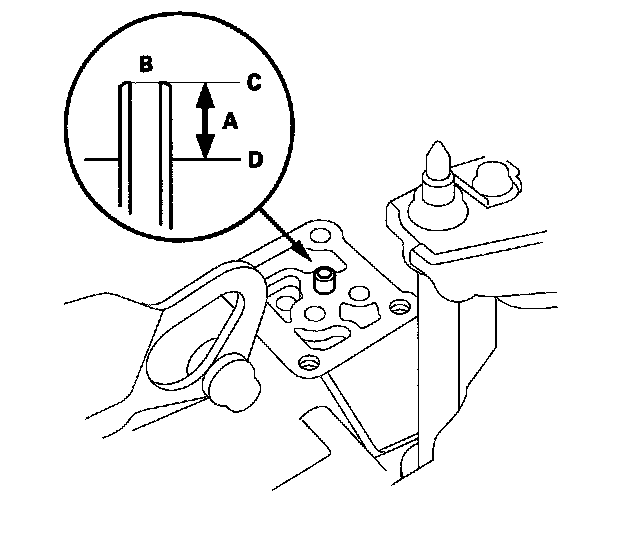 8. Check the height (A) of the 8 x 53 mm ATF joint pipe (B) between the top (C) of the pipe and solenoid valve body mounting surface (D). The height is about 7 mm (0.3 in.) If the height is over 7 mm (0.3 in.), push the pipe until it bottoms in the accumulator body.