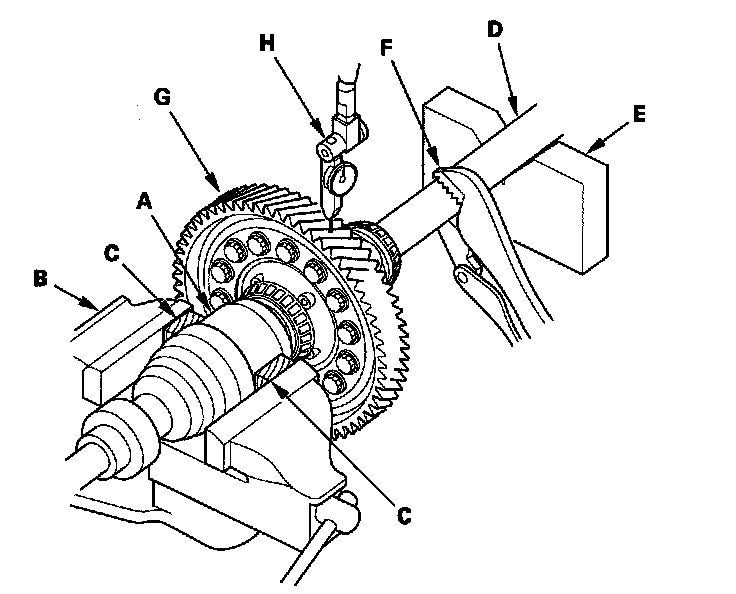4. Measure the backlash of the final driven gear (G) with a dial indicator (H).