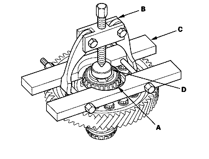 1. Remove the carrier bearing (A) with a commercially available bearing puller (B) bearing separator (C), and stepper adapter (D).
