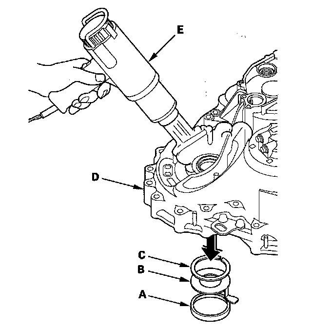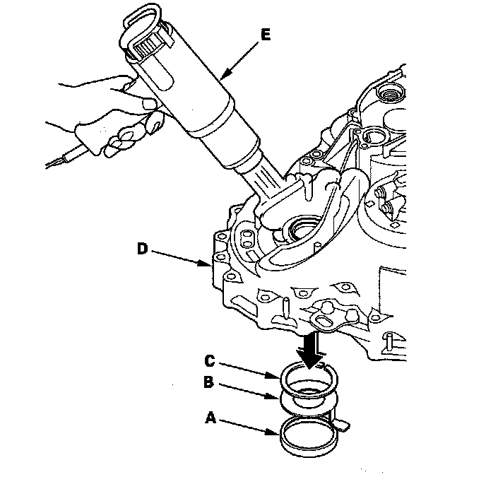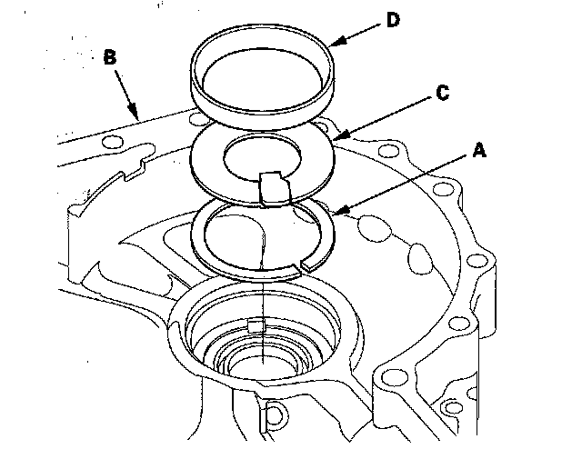 5. Install the spacer (C) and the bearing outer race (D) in the transmission housing.