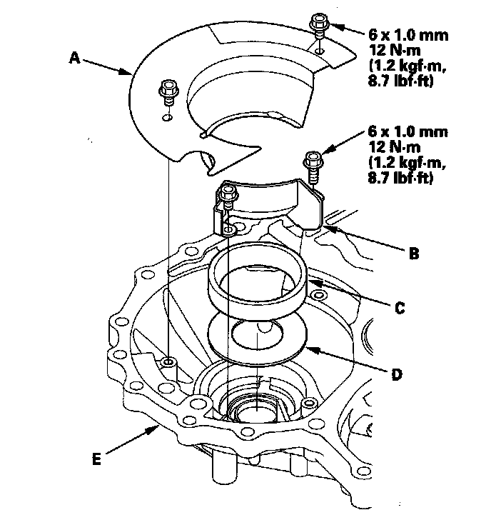4. Remove the plates (A) (B), and remove the bearing outer race (C) and spacer (D) from the torque converter housing (E).