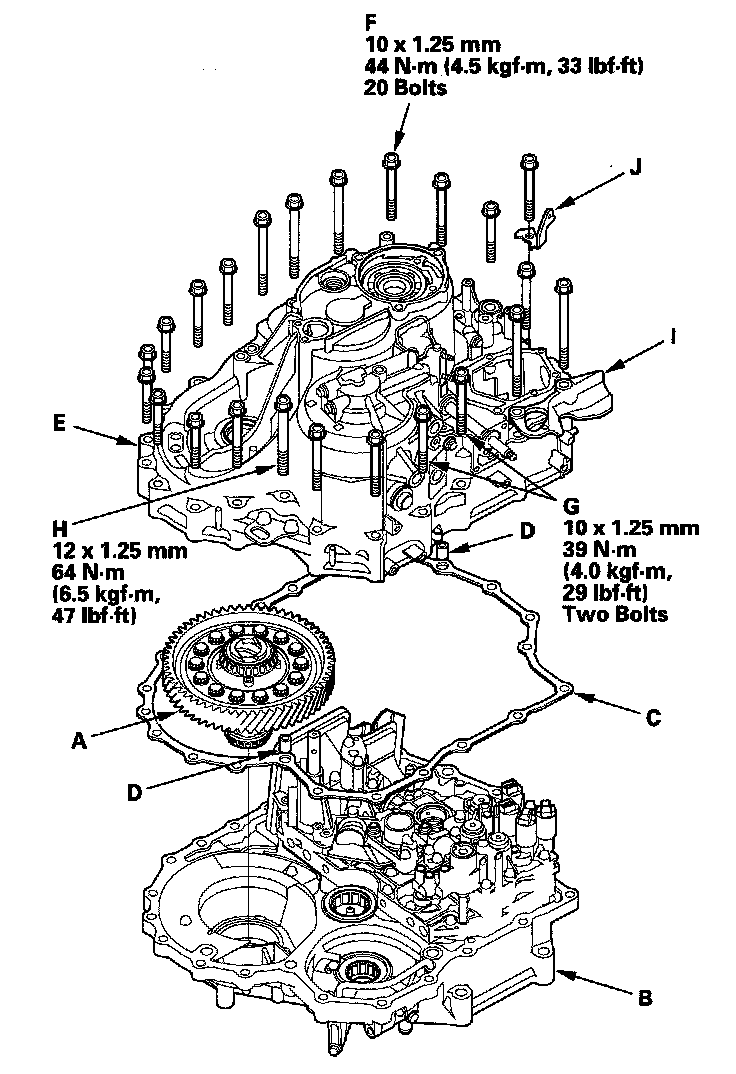 8. Install the transmission housing (E), then and install and tighten the mounting bolts (F) (20 bolts) to the specified torque. Install and tighten the mounting bolts (G) (2 bolts) to the specified torque. Install the 12 x 1.25 mm bolt (H) with the transmission hanger (I) and the ground terminal bracket (J), then tighten the bolts to the specified torque.