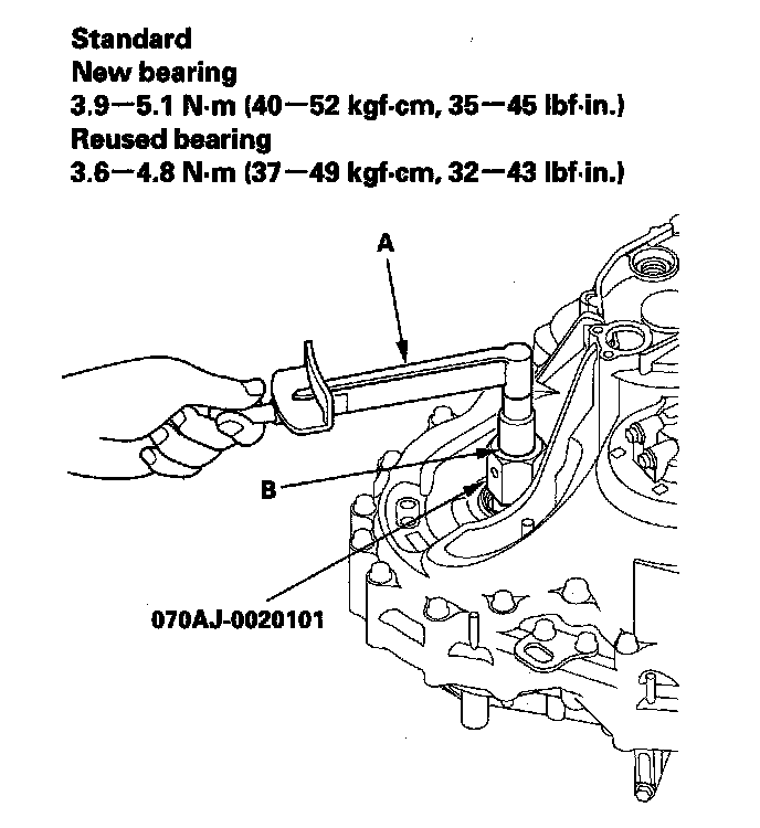 10. Measure the starting torque of the differential assembly with the preload inspection tool, a torque wrench (A), and a socket (B). Measure the staring torque at normal room temperature in both directions.
