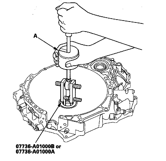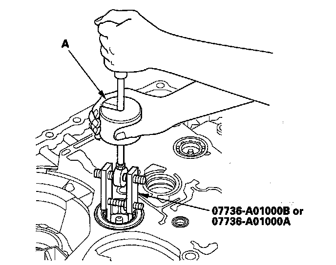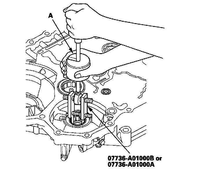 1. Remove the mainshaft bearing and oil seal using the adjustable bearing puller (25-40 mm) and a commercially available 3/8"-16 slide hammer (A).