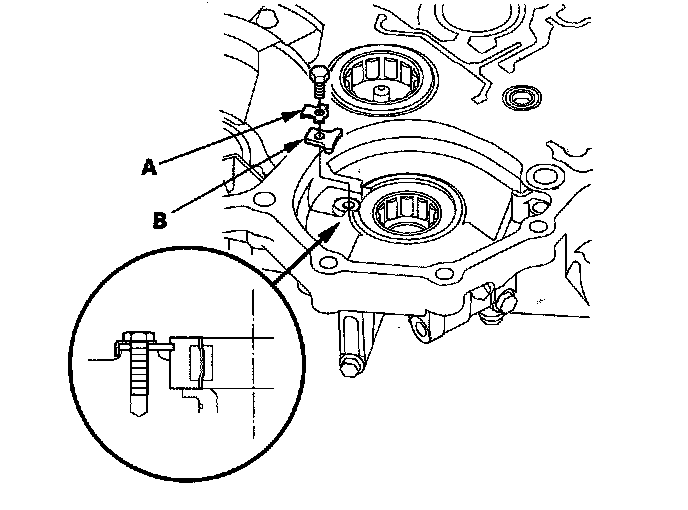 1. Remove the bolt, then remove the lock washer (A) and bearing set plate (B).