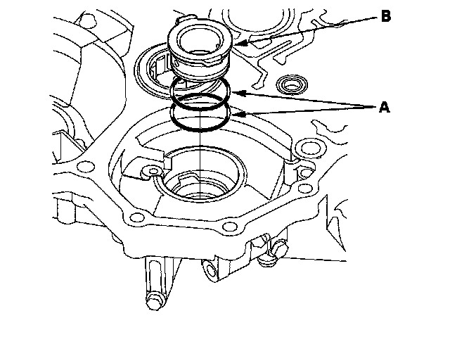 6. Install the new O-rings (A) on the ATF guide collar (B), then install the guide collar in the torque converter housing.