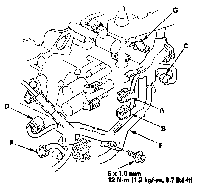 11. Remove the bolt securing the harness cover (F), and remove the harness cover from its bracket (G).
