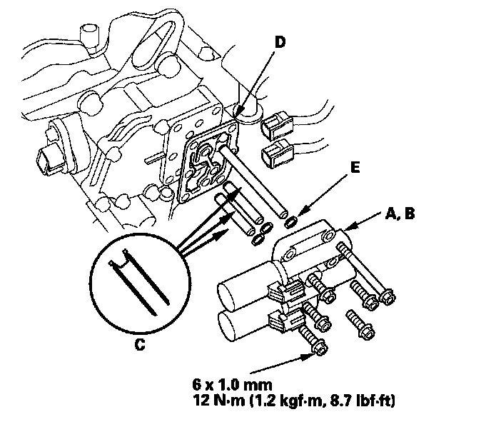 NOTE: Do not install shift solenoid valve C before installing shift solenoid valve A. If shift solenoid valve C is installed before installing shift solenoid valve A, it may damage the hydraulic control system.