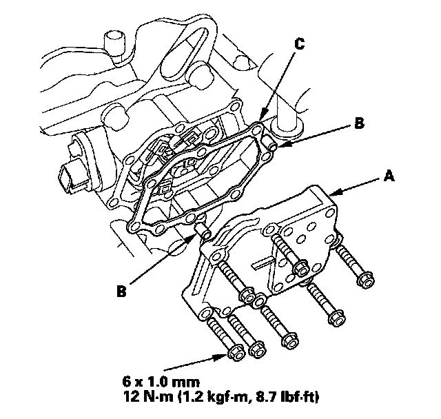 14. Remove the solenoid valve cover (A), dowel pins (B), and gasket (C).