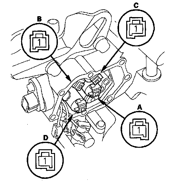16. Disconnect the connectors from shift solenoid valve A, shift solenoid valve B, shift solenoid valve C, and shift solenoid valve D.
