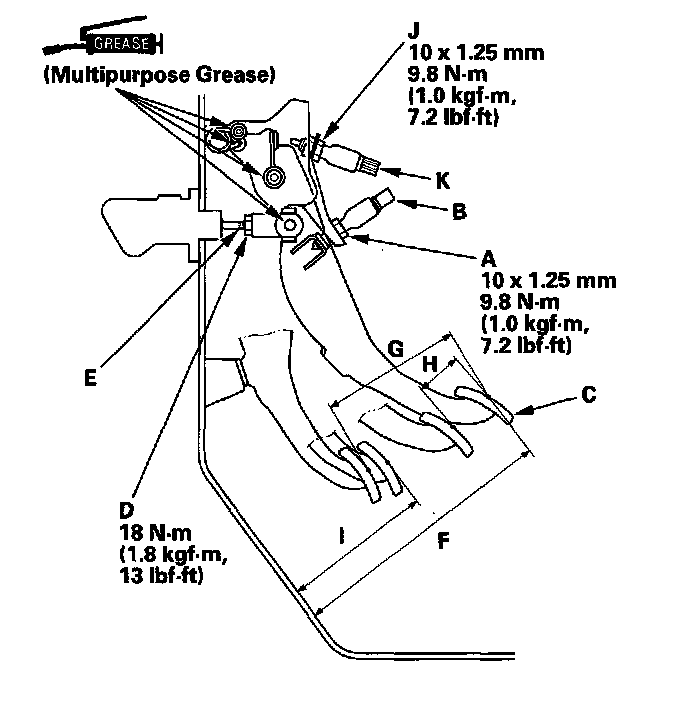 9. Release the clutch pedal 9-12 mm (0.35-0.47 in.) from the fully pressed position, and hold it there. Adjust the position of the clutch interlock switch (K) so the engine will start with the clutch pedal in this position.