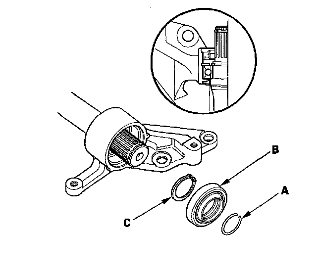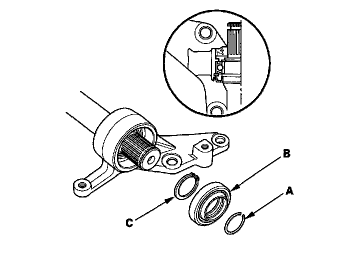 2. Remove the set ring (A), the oil seal (B), and the external snap ring (C).