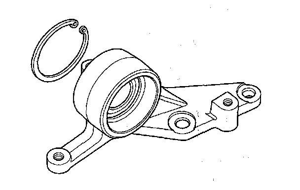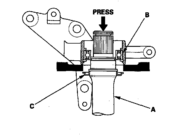 3. Press the intermediate shaft (A) out of the intermediate shaft bearing (B) using a press. Be careful not to damage the bearing support ring (C) on the intermediate shaft during disassembly.