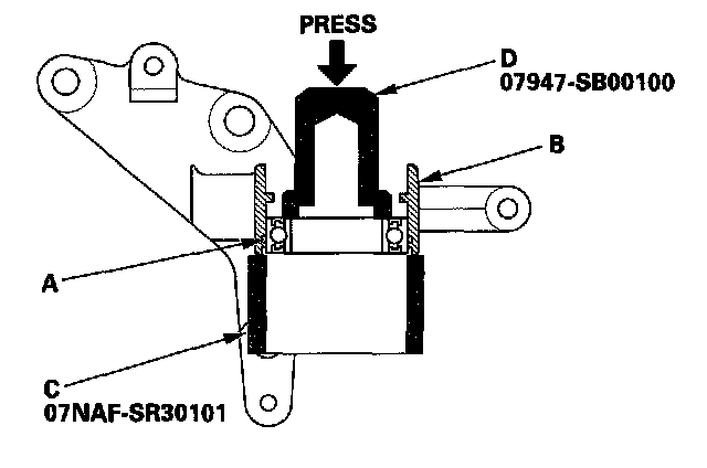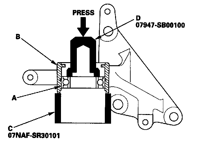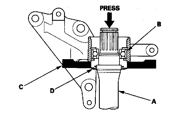 5. Press the intermediate shaft bearing (A) out of the bearing support (B) using the half shaft base (C), oil seal driver (D), and a press.