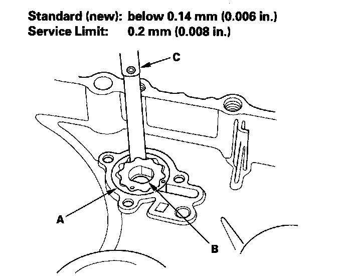 3. Measure the side clearance between the outer rotor (A) and inner rotor (B) with a feeler gauge (C).
