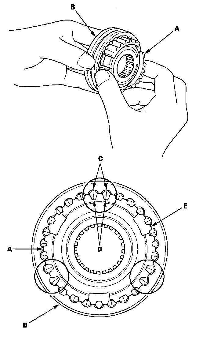 2. Install each synchro hub (A) in its mating synchro sleeve (B), and check for free movement. Make sure you match the three sets of longer teeth (C) (120 degrees apart) on the synchro sleeve with the three sets of deeper grooves (D) in the synchro hub. Do not install the synchro sleeve with its longer teeth in the synchro hub slots (E) because it will damage the spring ring.