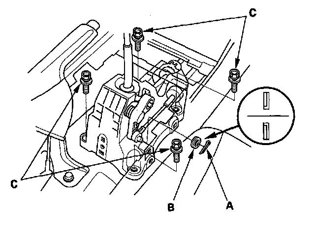 4. Remove the shift lever assembly (A) from the shift cable (B) and the select cable (C).