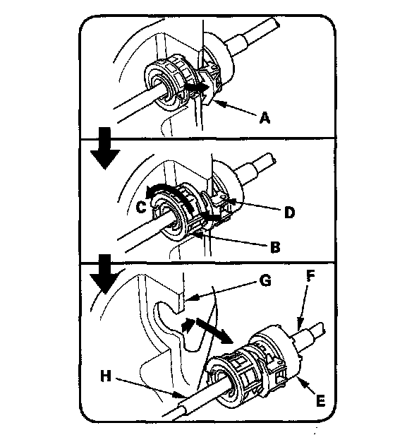 7. Slide the socket holder (E), and the shift cable (F) out of the shift cable bracket (G). Do not remove the shift cable by pulling the shift cable guide (H).