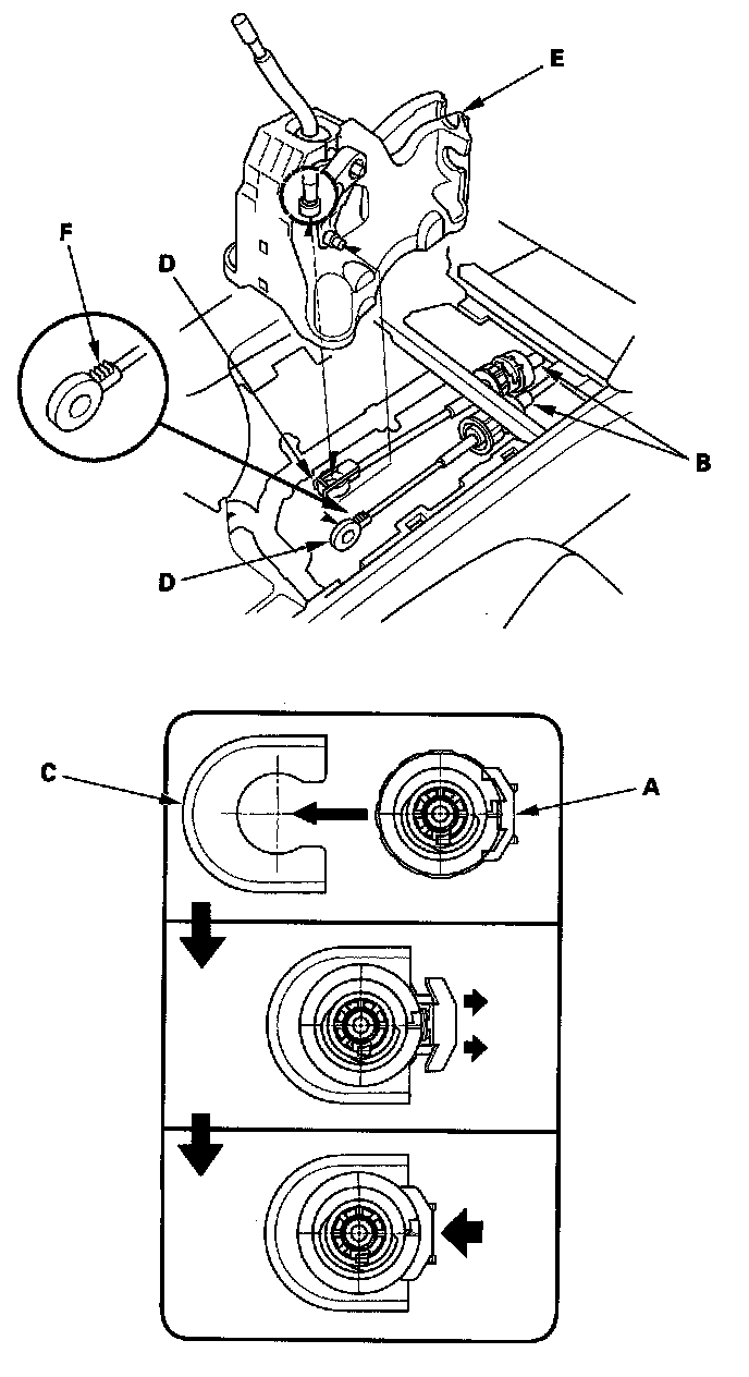8. Align the socket holder (A) on the shift cables (B) with the slot in the bracket base (C), then slide the holder into the base. Install the shift cable ends (D) to the shift [ever assembly (E) then install the shift lever assembly.