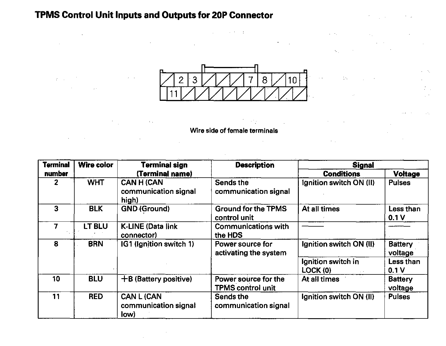 TPMS Control Unit Inputs And Outputs For 20P Connector: