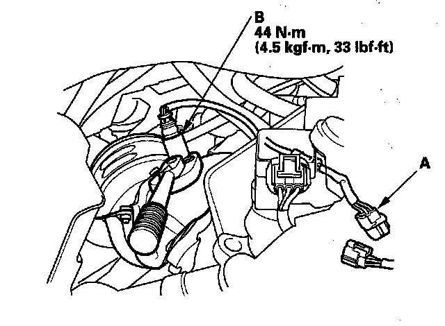 2. Disconnect the A/F sensor 4P connector (A), then remove the A/F sensor (B).