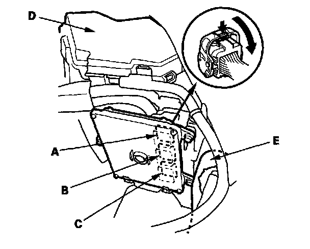 4. Remove the coolant reservoir (E). Disconnect PCM connectors A, B, and C.