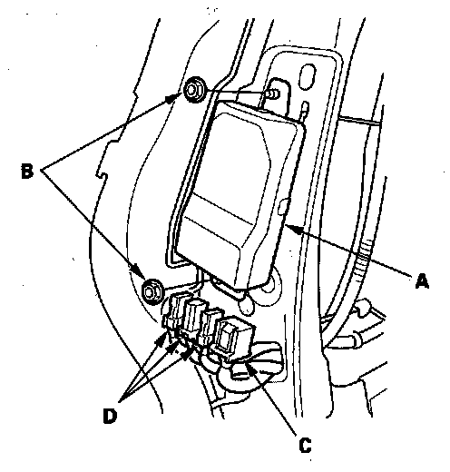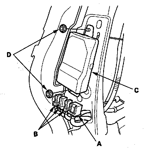 1. Place the ODS unit (A) on the seat-back frame. Tighten the two nuts (B), and connect the ODS unit harness 18P connector (C) and sensor connectors (D) to the ODS unit.