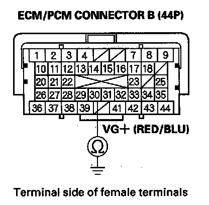 12. Check for continuity between ECM/PCM connector terminal B30 and body ground.