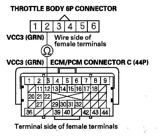15. Check for continuity between ECM/PCM connector terminal C12 and throttle body 6P connector terminal No. 2.