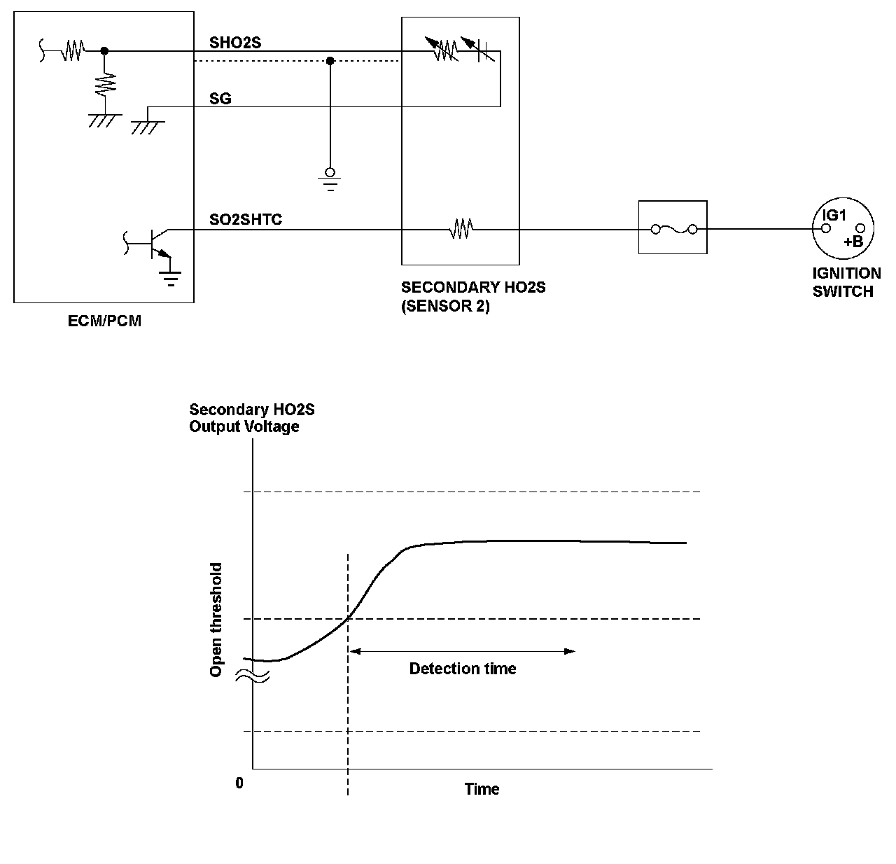 After current is applied to the secondary HO2S heater, if the secondary HO2S output continues high (rich) exceeding the upper limit used during feedback control, a malfunction is detected and a DTC is stored.