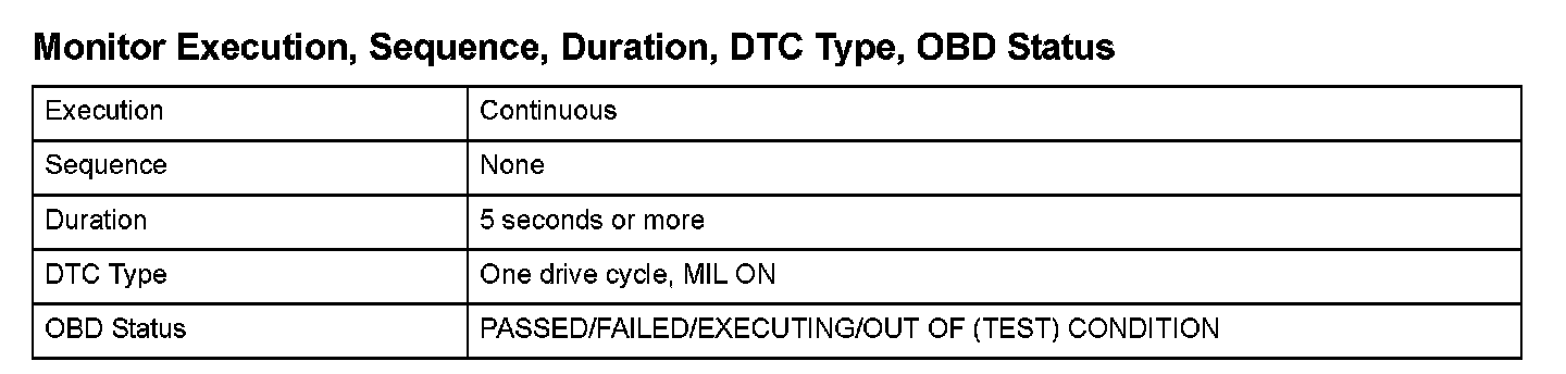 Monitor Execution, Sequence, Duration, DTC Type, OBD Status