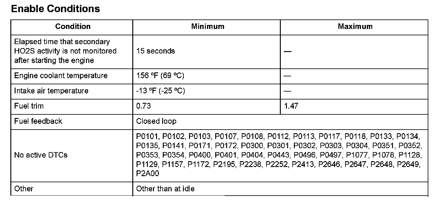 The secondary HO2S output voltage is 1.270 V or more for at least 5 seconds.