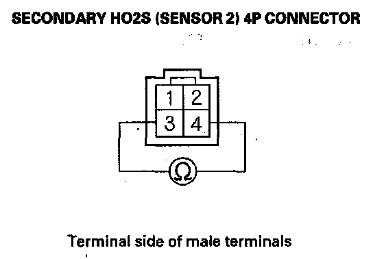 8. At the secondary HO2S (Sensor 2) side, measure resistance between secondary HO2S (Sensor 2) 4P connector terminals No. 3 and No. 4.