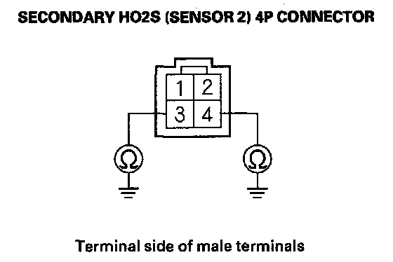 9. At the secondary HO2S (Sensor 2) side, check for continuity between body ground and secondary HO2S (Sensor 2) 4P connector terminals No. 3 and No. 4 individually.